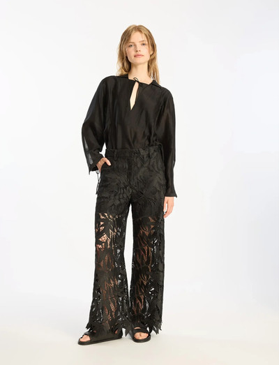 The top is crafted from a lightweight, sheer fabric featuring delicate ties at the neckline and cuffs. It has an open V-neckline, a collar, long sleeves, and a relaxed, airy fit