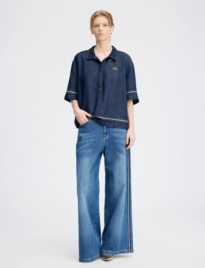 Beautiful denim blouse with decorative rhinestones and contrast stitching. The blouse features short sleeves, a classic collar, a half button placket, and a small embroidered emblem on the chest.