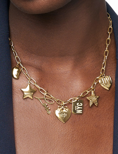 A charming array of pendants dangles from this chain necklace. The delicate chain features an assortment of shapes, including hearts and stars, offering a playful yet elegant touch to any outfit.