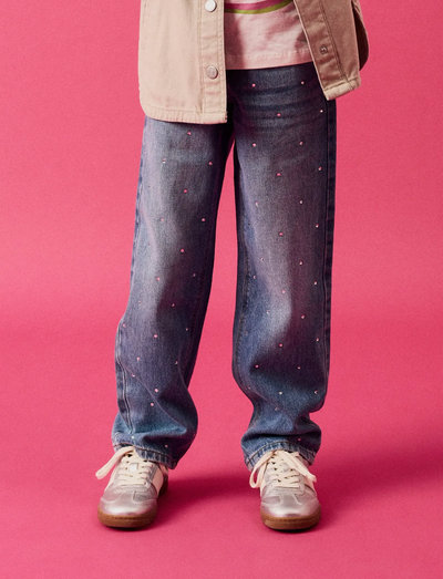 Find the perfect jeans and surprise your child with timeless styles that ensure a cool look and freedom to move. Denim is a durable woven fabric available in several expressions for a unique look. - Product Type : Straight fit jeans - Closing : Hook button and zip fly fastening - Extra details : Adjustable waist, Badge, Rhinestones - Fit : This pair of jeans has a regular fit hip and straight fit legs