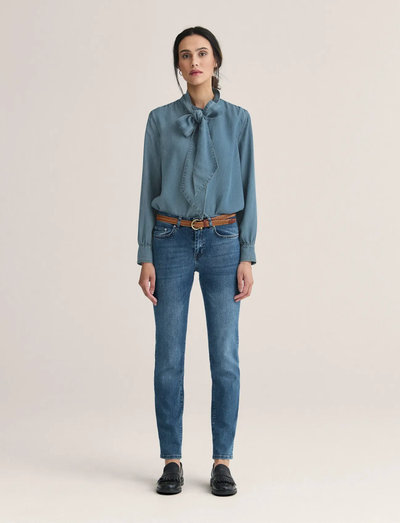 Tie collar shirt in Indigo dyed Tencel. The sleeve has a small, feminine puff effect.