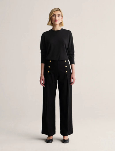 High-waisted trousers with front pleats for a flattering silhouette. Decorated with elegant logo buttons in gold-colored metal.