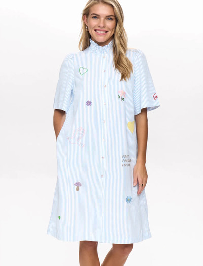 Striped shirt dress featuring whimsical embroidery. This charming piece has a ruffled high neckline and short sleeves. The playful embroidery adds a touch of personality.
