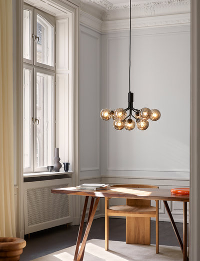 Modern chandelier inspired by umbellifer flowers. Apiales 9 unfolds its 9 metal arms from the stem, and the stalks are capped with mouth-blown glass globes. Create evocative lighting in the living room or above a dining table with the Apiales 9 chandelier.