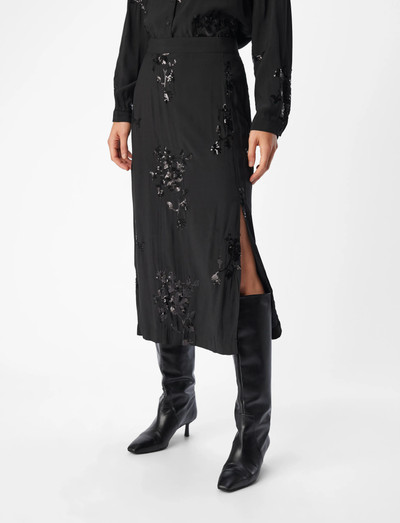 Floral embellishments lend a touch of elegance to this skirt. The midi-length design features a subtle side slit, adding a modern edge to a classic silhouette.