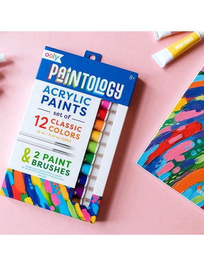 Take your artistic talent to the next level with this Paintology acrylic paint set. It contains 12 paint tubes in all classic colours such as white, blue, black, brown, red, purple and much more. This acrylic paint set even includes two brushes, so all you need to provide is the canvas and your imagination. The set includes 12 acrylic paints, 12 ml each