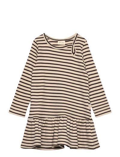 Long sleeved dress made in our classic striped rib quality. In the left side of the neck opening, we have our signature opening with a push button for easy opening. The dress has a low cutline with gathers at the bottom of the dress for a girly fit. The material is soft and very stretchable, made for comfort and play. Made in India.