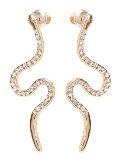 Unique statement earrings with gold-plated serpents set with crystals. In these earrings, the serpents hang down from the earlobes, coiling beautifully below your ear. The serpent’s twists are highlighted in the row of sparkling crystals. Emphasise your seductive femininity and creativity with these luxe earrings showcasing the alluring and mysterious serpent.