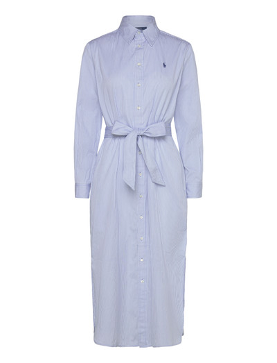 A self-tie belt cinches the waist of this striped shirtdress, creating a flattering silhouette. The classic button-front design and long sleeves make it a versatile choice for various occasions.