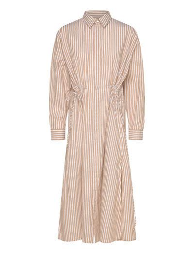 Featuring a classic striped pattern, this shirtdress offers a refined silhouette. The design incorporates a drawcord at the waist for an adjustable fit, complemented by a full button-down front and side slits for ease of movement.