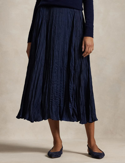 This satin skirt is cut for an A-line silhouette and features an allover crinkled texture.Mid-rise. A-line silhouette. Intended to hit at the mid-calf.Size medium has a 33.5" length. Skirt length is taken from the center back of the waist and changes 0.5" between sizes.Elasticized waist. Pull-on styling.
