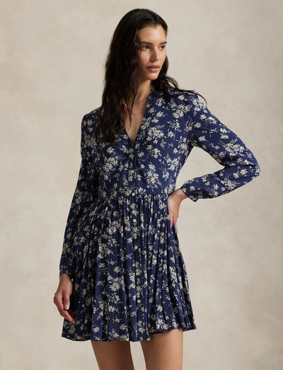 Crafted with ultralightweight crepe, this floral dress is designed with a buttoned front placket featuring genuine mother-of-pearl buttons. Its fit-and-flare silhouette has a full skirt with shirring at the waist for added volume.Fit-and-flare silhouette. Intended to hit at the thigh.US size 8 has a 33.5" body length and a 34.5" sleeve length. Body length and sleeve length are taken from the center back. Sleeve length changes 0.5" between sizes.V-neckline. Buttoned placket with genuine mother-of-pearl buttons.