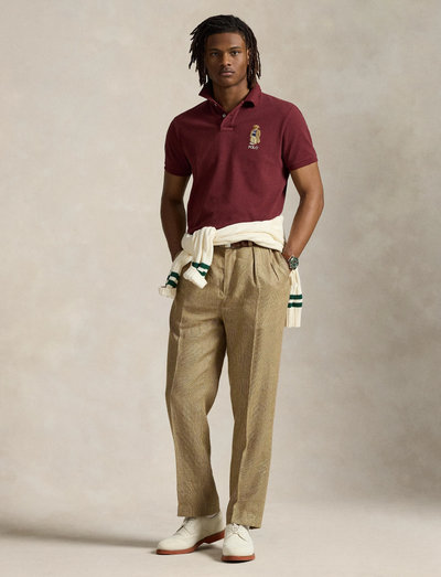 An American style standard since 1972, the Polo shirt has been imitated but never matched. Over the decades, Ralph Lauren has reimagined his signature style in a wide array of colors and fits, yet all retain the quality and attention to detail of the iconic original. This version features our beloved Collegiate Bear with a few stylish updates—tortoiseshell glasses and a Polo-emblazoned pullover.Custom Slim Fit: a trim silhouette in between our Classic Fit and Slim Fit. Sleeve hugs the bicep. Tailored through the waist.Size medium has a 27” front body length, a 28” back body length, a 17.5” shoulder, and a 41” chest.Ribbed Polo collar. Two-button placket.Short sleeves with ribbed armbands.Polo Bear and "Polo" embroidered at the left chest. Tennis tail.