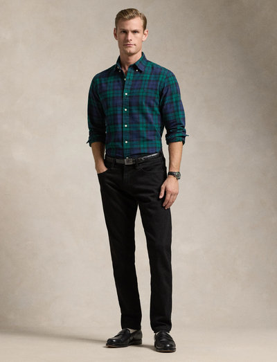 The oxford shirt made its debut very early on in Ralph Lauren’s designs, and since then it has solidified its status as a pillar of the Polo look. Today, Mr. Lauren continues to create countless variations of his iconic shirt, including this plaid version that is brushed and washed for superior softness.Custom Fit: a trim silhouette in between our Classic Fit and Slim Fit. Tailored through the waist.Size medium has a 31.5" back body length, an 18.25" shoulder, a 44" chest, and a 34.5" sleeve length. Sleeve length is taken from the center back of the neck and changes 1" between sizes.Button-down collar. Buttoned placket. Long sleeves with buttoned barrel cuffs.