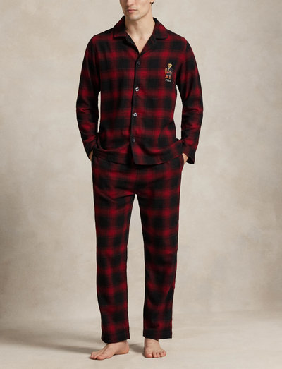 The beloved Polo Bear adds a festive touch to the long-sleeve shirt and pants in this pajama set, which are crafted with soft plaid cotton flannel.Size medium shirt has a 30.5" body length and a 25.5" sleeve length. Size medium pant has a 30" waist that expands to 42" and a 13.75" rise.Shirt: notch lapels; buttoned placket; long sleeves.Pant: elasticized drawstring waistband with woven “Polo Ralph Lauren” label at the front; single-button fly; side on-seam pockets.