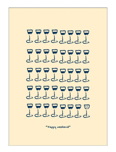Kick off your weekend with a smile and a toast! This playful "Happy Weekend" poster features a grid of wine glasses, with one cheeky glass standing out, sporting a happy face. Perfect for bringing a touch of humor and lighthearted fun to your space, this artwork is ideal for setting a cheerful tone as you unwind and enjoy your well-deserved break. Great for kitchens, bars, or any place where you celebrate the joy of the weekend!*Frame sold separately.