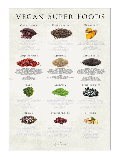 Discover a vibrant collection of vegan superfoods on this poster. From nutrient-packed greens to antioxidant-rich berries, elevate your health with these plant-based powerhouses. *Frame sold separately.
