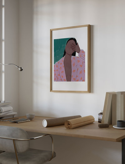 Delve into the depths of emotion with 'Frøya' by Sunniva Richardsen. This evocative piece captures a moment of introspection, using a rich palette of colors and bold patterns. The contrasting deep teal background and the soft pink patterned attire evoke a sense of mystery and elegance. Perfect for those who appreciate art that tells a story. *Frames sold separately