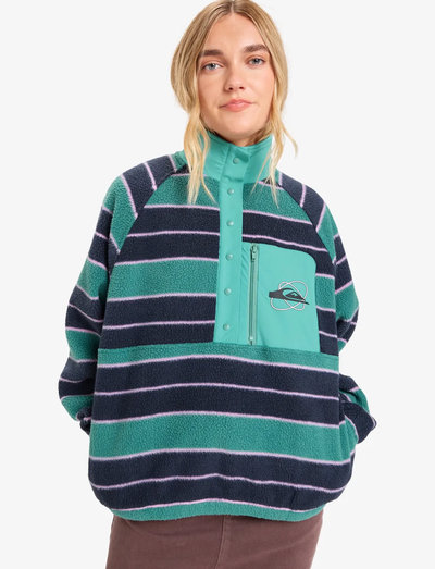 Type: Polar fleece,Fabric: 100% polyester (260 g),Fit: Regular fit with raglan sleeves,Contrasted nylon fabric on collar center front placket and chest pockets,Chest pocket with zip opening,Elasticated cuffs and bottom hem,Solid version and stripe version,Quiksilver seasonal label or graphic at chest pocket,[Main Fabric] 100% Polyester