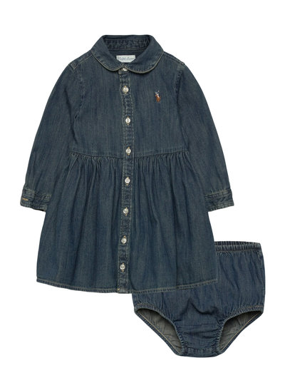 Crafted from lightweight denim, this dress offers a comfortable fit and classic style. The design features a button-up front and a gently flared skirt, making it perfect for everyday wear. It comes complete with matching bloomers.