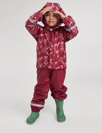 This kids' warm rain jacket comes with a comfy fleece lining. It's made from a flexible material that doesn't harden in the frost. By adding extra layers for additional cosiness, you get a rain jacket for all year around. Its seams have been welded waterproof so that no rain gets through to skin. The detachable hood is safe during active outings and is attached with snap buttons that come off easily if it gets caught on something. This rain jacket for kids has elasticated cuffs and reflective details on the sleeves and hood. All Reima rainwear is made from a soft material without PVC.
