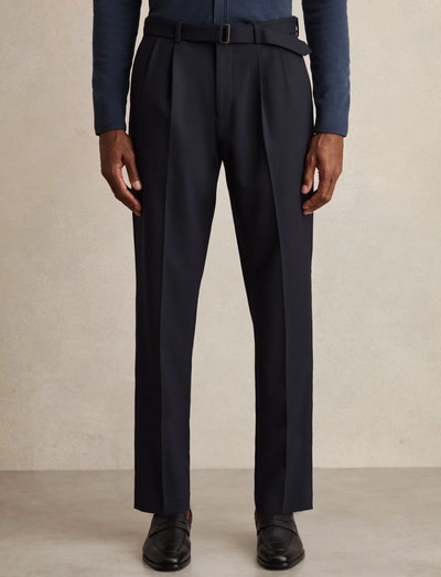 Tailored from a premium wool blend in a twill weave, the Strap trousers are the perfect choice for refined summer events. They’re cut for a regular fit and taper slightly towards the ankle for a modern silhouette. Elegant front pleats and slide-buckle belt offer a polished finish.