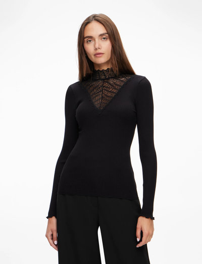 Delicate lace detailing at the neckline elevates this long-sleeve top. The fitted silhouette makes it ideal for layering or wearing on its own. Finished with subtle ribbed detailing throughout.