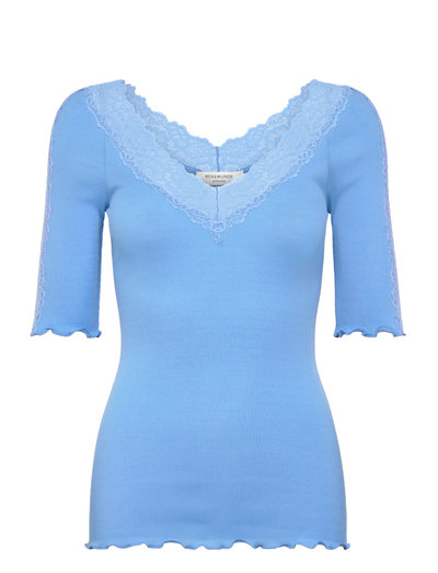 Delicate lace trim elevates this fitted T-shirt. The quarter-length sleeves and soft material make it a comfortable and stylish choice.