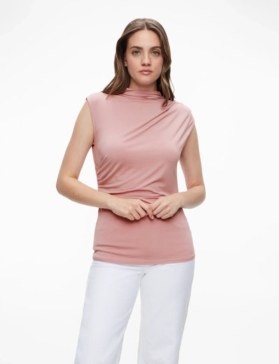 Crafted for a flattering fit, this sleeveless top features elegant draping at the shoulder and side. The high neckline adds a touch of sophistication, making it a versatile piece for both casual and dressy occasions.