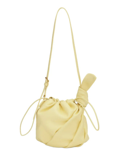 Crafted from smooth leather, this shoulder bag features a gathered drawstring closure and a distinctive knotted detail on the side. Its adjustable strap allows for versatile wear.