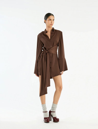 Crafted in a lustrous satin, this shirt dress features a tie waist for a flattering silhouette. The long sleeves and button-down front add a classic touch, while the fluid fabric drapes beautifully.