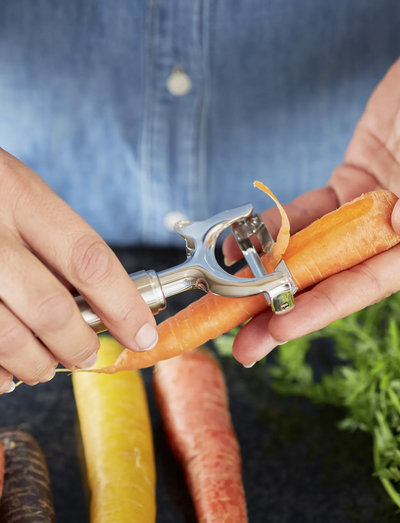 The swivel peeler works beautifully on long, slender vegetables, and removes the skin from carrots, cucumbers, and courgettes with ease. With replaceable blade. Not dishwasher-safe.(R12735)