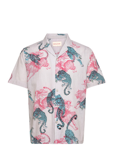 A Cuban short- sleeved shirt crafted from a light-weight organic cotton fabric with a weave of thin and thick threads that gives the shirt a characteristic coarse structure. The colorful all-over leopard meets tiger print gives the shirt character and makes it a perfect choice for the summer days. The shirt has a button-up front finished with 4-hole tone-in-tone buttons and a Cuban collar. The hem is curved for easy layering, and the back is designed with a traditional double-layer yoke with a box-pleat for extra comfort