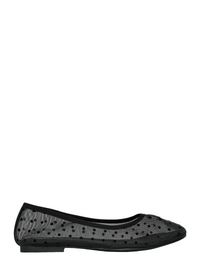 • Transparent mesh • Velvet dots • Elastic strap over the instep • Flat sole with a small block heel