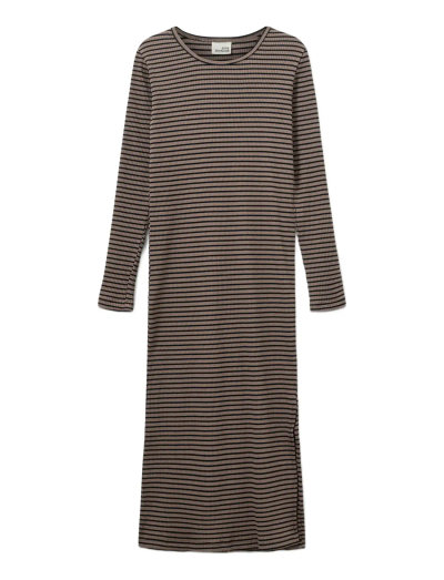 A classic striped pattern defines this long-sleeved dress, making it a versatile addition to any wardrobe. The comfortable design ensures ease of movement, perfect for everyday wear.