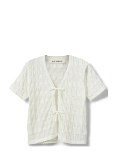 This short-sleeved cardigan features an open knit design and tie closures, offering a light and airy feel. Perfect for layering, it adds a touch of elegance to any outfit.
