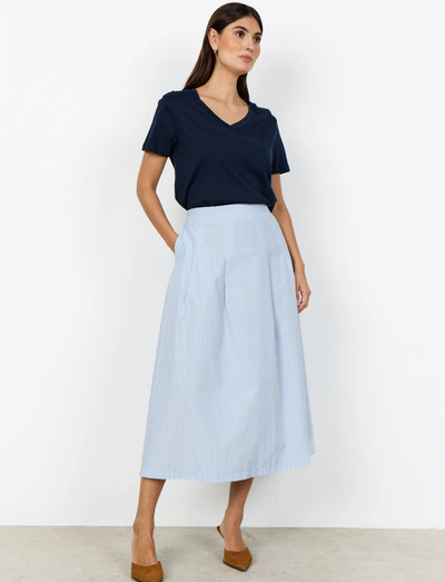 SC-CASSY 4 Skirt is crafted from 53% recycled polyester and 47% organic cotton. The skirt features a flattering A-line silhouette with subtle pleats and a classic pinstripe print. Pair it with a simple blouse and sandals for an elegant look.