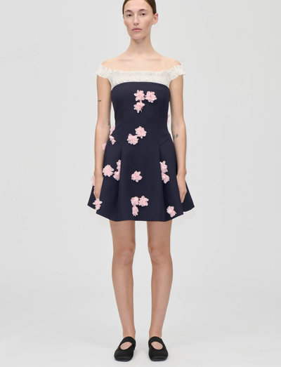 Mini dress with a flared silhouette and delicate 3D floral details. Finished with contrast ruffled straps and a hidden side zip.