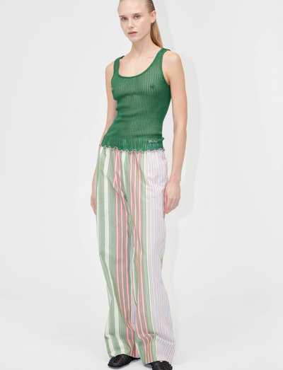Classic silky sleeveless tanktop with scoop neck in front and back, semi-sheer ribbed material and playful crinkled hem.