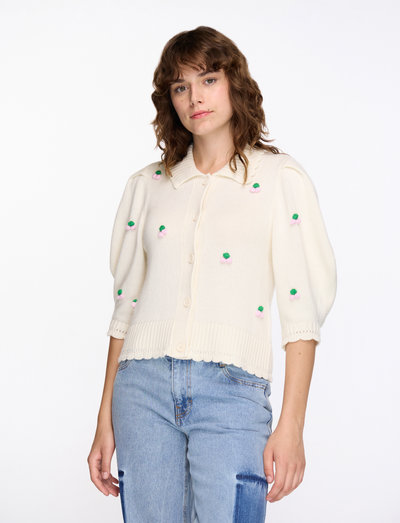 Knitted cardigan with puff sleeves and subtle floral embroidery. A soft, feminine piece with classic detailing.