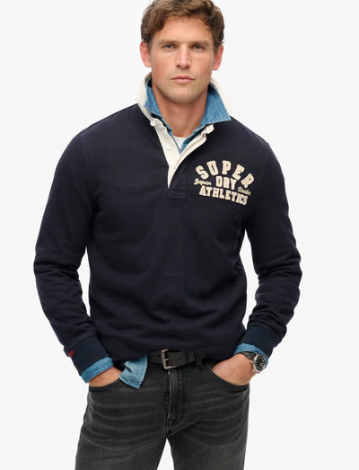 Relaxed fit – the classic Superdry fit. Not too slim, not too loose, just right. Go for your normal size. Midweight jersey material with underarm ventilation. Traditional button fastening with a standard white collar. Ribbed cuffs and split side seams. A vintage sporty aesthetic is always a big hit in any wardrobe, so we've combined all the classic styling cues of rugby apparel with our signature comfort and quality to bring you the Vintage Athletic Rugby Shirt. We've kept things simple and authentic with the details, but the distressed embroidered logo offers a distinctly Superdry twist to keep things fresh. You certainly don't have to be part of the scrum to be able to pull off this shirt.