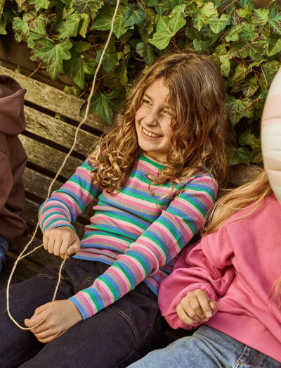 Long-sleeved ribbed blouse from THE NEW with horizontal stripes in shades of pink, blue, green and purple. It's a colorful but basic blouse suitable for all ages and can be styled for both everyday wear and special occasions. Can be paired with the matching TNPiper Wide Rib Pants for a colorful set. - Regular fit. - Long sleeves. - Round neckline. - Striped. - Ribbed quality. - GOTS Organic certified by CU842535