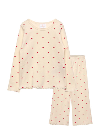 This pajama set from THE NEW Siblings is both soft and sweet – perfect for relaxing and cozy nights. The set includes a long-sleeved top and matching pants featuring a cute all-over heart print and feminine lettuce-edge hems for a playful touch. The stretchy ribbed fabric ensures a comfy fit with plenty of freedom to move.- Set with long-sleeved top and pants - All-over heart print - Lettuce-edge hems at sleeves, legs, and hem - Soft and stretchy ribbed material - Ideal for sleep and cozy downtime- GOTS Organic, certified by Control Union, 842535.