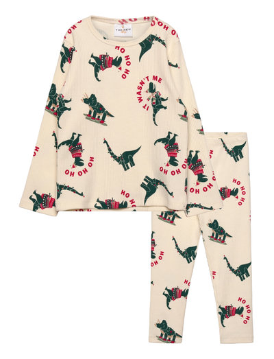 This pajama set from THE NEW Siblings is both cozy and festive – perfect for bedtime during the holiday season. It includes a long-sleeved top and matching pants with a fun all-over print, available in two versions: cats wearing Santa hats or dinosaurs in Christmas outfits. The soft and stretchy ribbed fabric ensures great comfort and freedom of movement all night long.- Set with top and pants - Festive all-over prints: Christmas cat or holiday dinosaur - Soft and stretchy ribbed quality - Snug fit - Perfect for cozy holiday nights and morning cuddles- GOTS Organic, certified by Control Union, 842535.