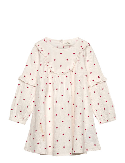 This dress from THE NEW Siblings is both romantic and comfortable – perfect for cozy and festive occasions. It features a sweet all-over heart print and delicate ruffle details along the chest and sleeves, adding a feminine and playful touch. The dress has long sleeves and a light A-line shape, providing great freedom of movement and a soft silhouette.- All-over heart print - Ruffles at chest and sleeves - Long sleeves - Light A-line fit - Comfortable and cute for everyday wear and special occasions