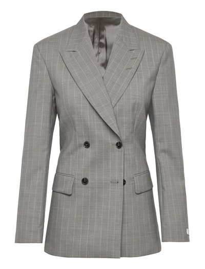 The Elmi blazer is a sophisticated peak-lapel design, tailored in a classic pinstripe 100% wool fabric. This double-breasted blazer features relaxed shoulders and a cinched waistline for a flattering silhouette. Details include a single vent at the centre back, welt pockets with flaps, and kissing buttons at the sleeve vent. Fully lined for comfort, it also includes an interior pocket. ToS's signature double buttonholes on the lapel add a distinctive finishing touch.