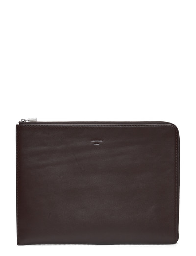 A sleek laptop case in LWG‑certified cow leather with leather lining, a half‑zip opening, branded puller, silver trims, and tonal embossed branding. Fit around 13inch laptop