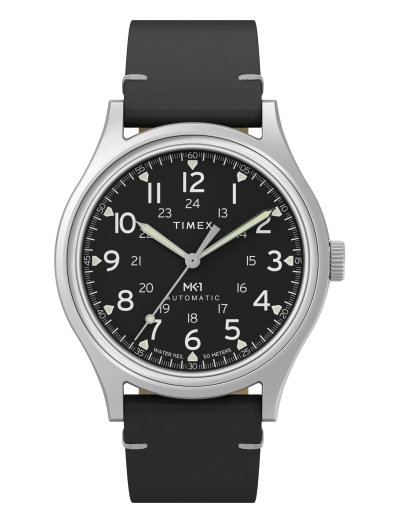 We’re reinventing our beloved MK1®, enhancing its classic military aesthetic with a blue-tinted exhibition window on the case back that reveals the reliable Japanese automatic movement ticking inside. The 40mm recycled stainless-steel case and domed acrylic crystal encase a sleek black dial with both 12 and 24-hour Arabic indices and luminant hands for enhanced visibility. Completing the look is a natural leather strap equipped with quick-release spring bars that require no tools.