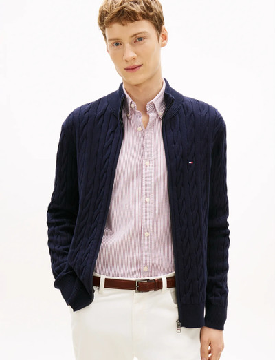 A classic cable knit design defines this zip-up cardigan. The full zip offers versatile styling options, while the ribbed trims ensure a snug fit. Perfect for layering, this piece adds a touch of texture to any outfit.