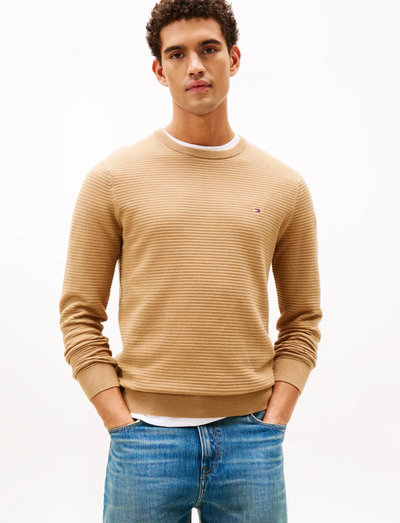 Featuring a subtle textured knit, this round neck sweater offers a refined look. The understated design is enhanced by the iconic flag logo on the chest, adding a touch of brand recognition.